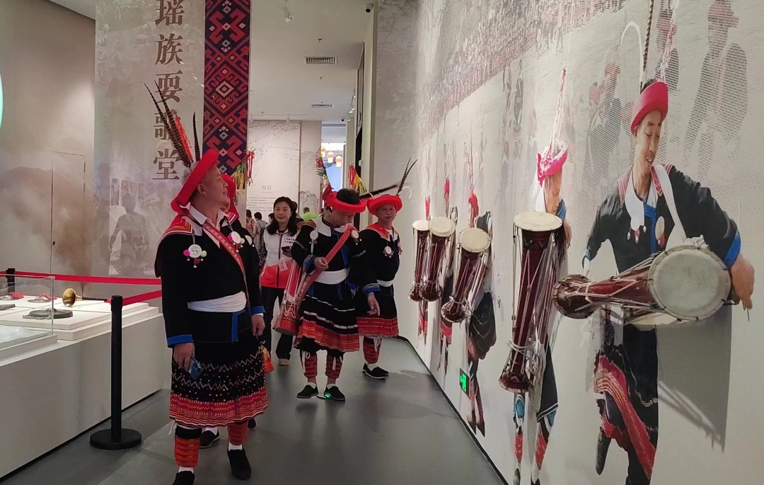 瑶族长鼓队队员们在非遗馆内参观