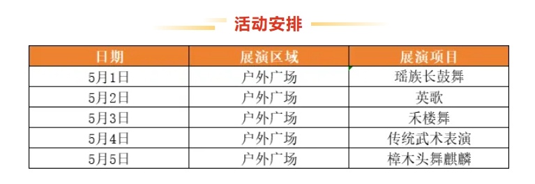 5月1日至5月5日,广东省非物质文化遗产馆将充分结合开馆活动主题,邀请瑶族长鼓舞、英歌、禾楼舞、传统武术、麒麟舞等各地级市传统舞蹈、传统体育游艺与杂技等非遗代表性项目展演队伍,展现人文湾区新活力,让群众近距离感受非遗魅力。