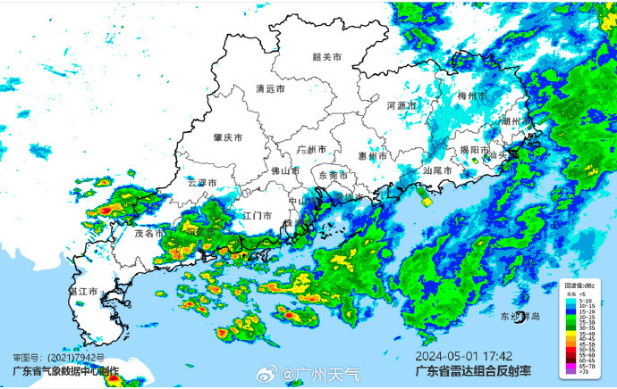 相较于4月30日下半夜,5月1日白天雨势有所减弱,珠江口西侧、粤西、粤东市县出现了中到大雨,广东其余大部市县出现小雨。