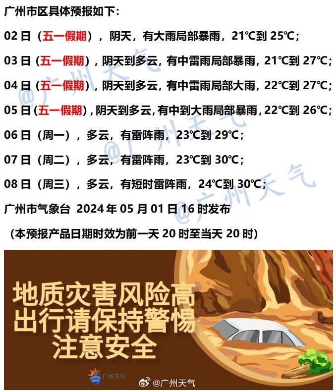 “五一”假期第一天,雨水终于给自己放了假,这也为后面的加班“充了电”。明后两天,广州都可能有局部暴雨,5月5日雨势也比较大。
