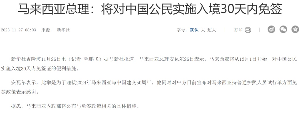 中方自2023年12月1日起,对包括马来西亚在内的6个国家持普通护照人员实行单方面免签政策,持普通护照人员来华经商、旅游观光、探亲访友和过境不超过15天,可免办签证入境。马来西亚随后也宣布,2023年12月1日起,马来西亚对中国公民实施入境30天内免签证的便利措施。