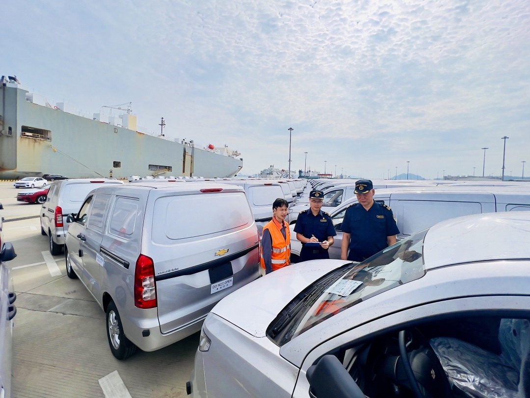 广州海关所属南沙海关关员对出口汽车进行监管