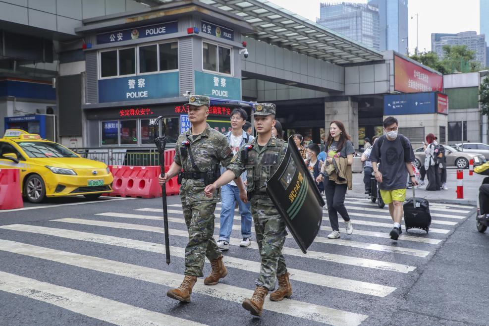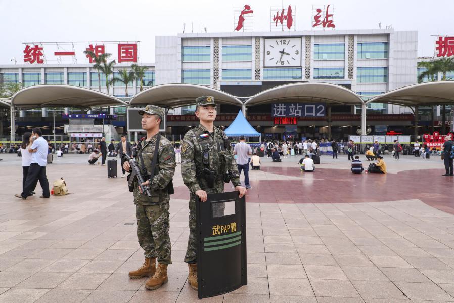 5月1日14时,在广州火车站,许多旅客正按计划有序出行。担负广州火车站执勤任务的武警广州支队执勤官兵加强对站前广场、进出站口和安检口等重点部位的警戒巡控,全力维护秩序,确保旅客出行安全。