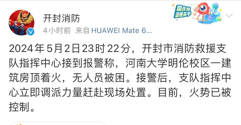 5月3日1时46分,开封消防发布官方通报称:“2024年5月2日23时22分,开封市消防救援支队指挥中心接到报警称,河南大学明伦校区一建筑房顶着火,无人员被困。接警后,支队指挥中心立即调派力量赶赴现场处置。目前,火势已被控制。 ”