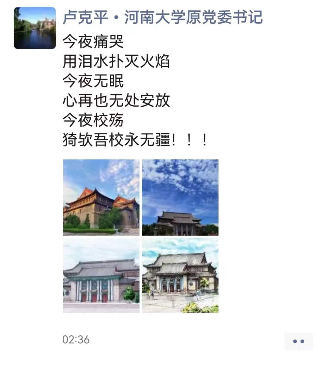 河南大学原党委书记卢克平凌晨2时36分在微信朋友圈发帖称:今夜痛哭,用泪水扑灭火焰。今夜无眠,心再也无处安放。今夜校殇,猗欤吾校永无疆!!!