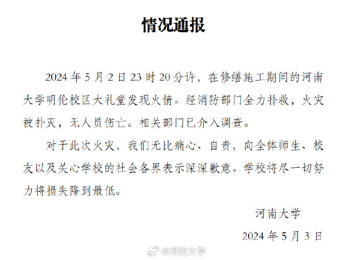 河南大学5月3日发情况通报称:5月2日23时20分许,在修缮施工期间的河南大学明伦校区大礼堂发现火情。经消防部门全力扑救,火灾被扑灭,无人员伤亡。相关部门已介入调查。
