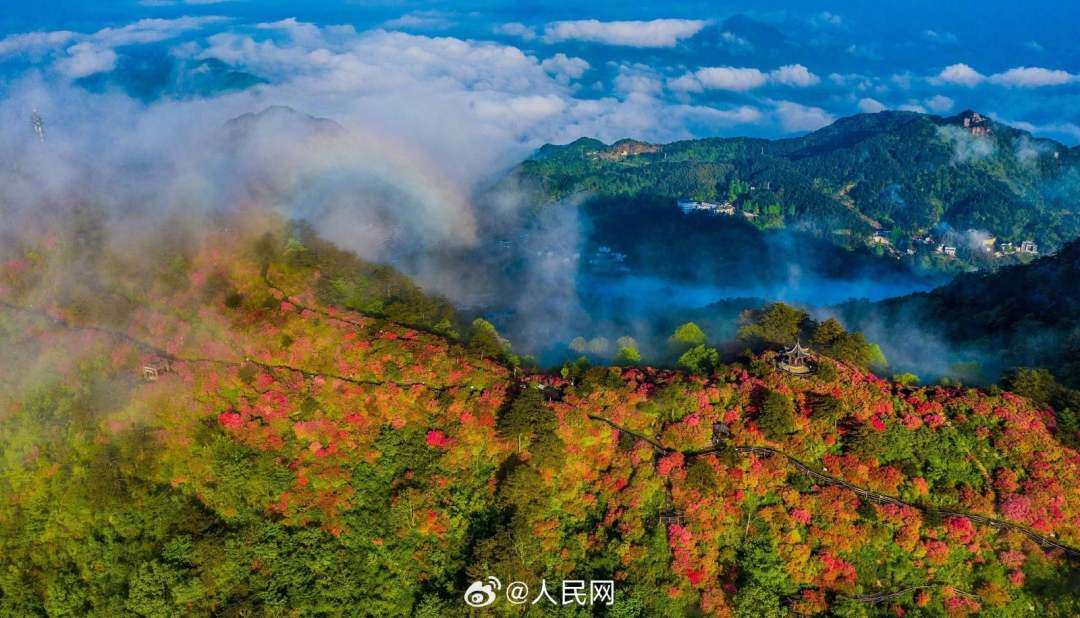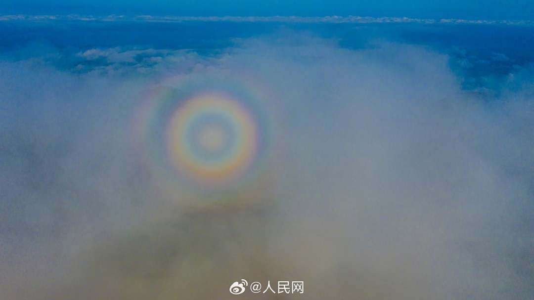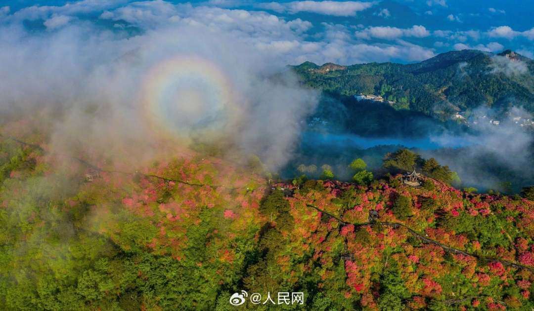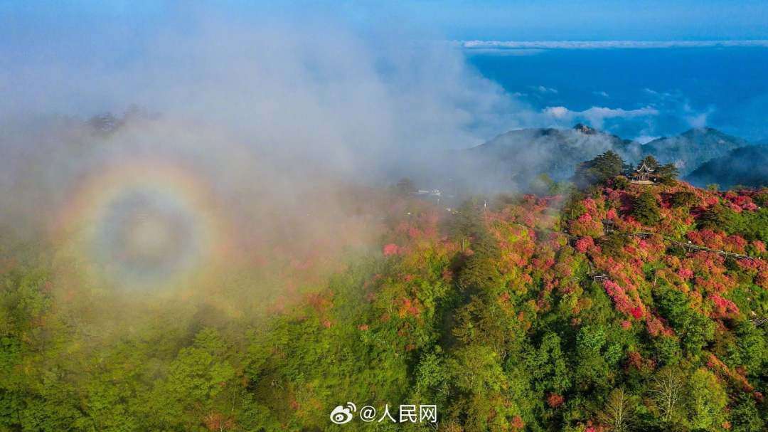 近日,湖北黄冈麻城龟峰山十万亩杜鹃花盛开,山上出现云海和“圈型”彩虹景观,十分壮美。