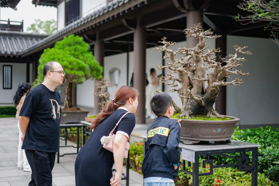 本次展览以岭南盆景艺术精选作品为主要展陈内容,展示40盆盆艺作品,集中陈列于中心阁前广场。展览现场,“咫尺千里”“缩龙成寸”的盆景作品吸引了游客驻足围观。参展作品中,《古榕新姿》出自广州盆景协会会长、中国盆景艺术大师罗小冬之手;《雪崖斜影》的雅致、《古朴雄风》的气势、《宫灯》《天外来客》《笑觅野翠》的奇思妙想……各有特色,令人目不暇接。