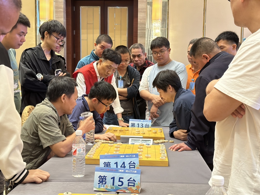 第13台的象棋比赛双方打的难解难分,吸引了众多选手围观
