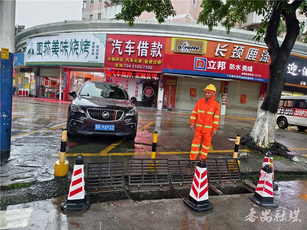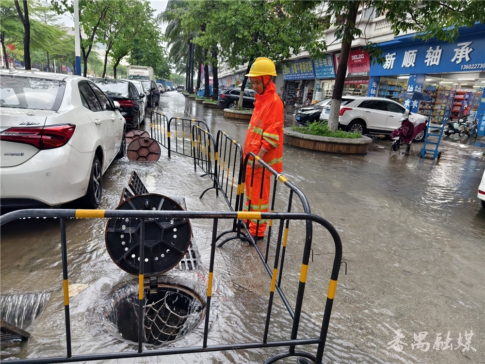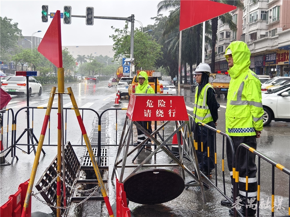 16时,记者在市莲路东华花园路口等水浸风险点看到,番禺区防汛抢险队员及时赶到现场布防,打开路面的雨水井盖排水,在雨水井周边设置围栏和安全警示标识牌,路面没有出现较深积水,道路畅通。