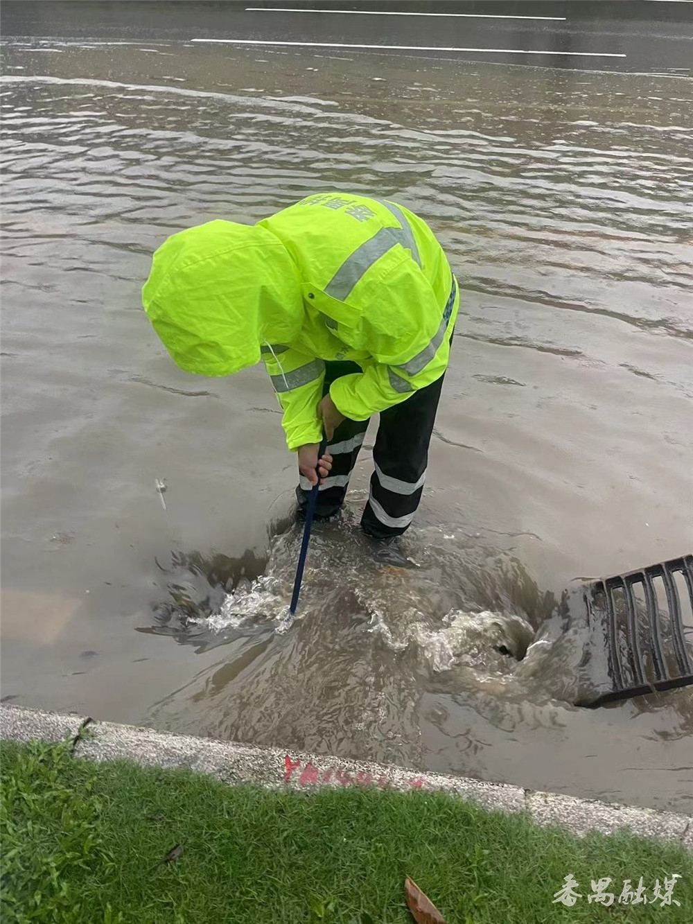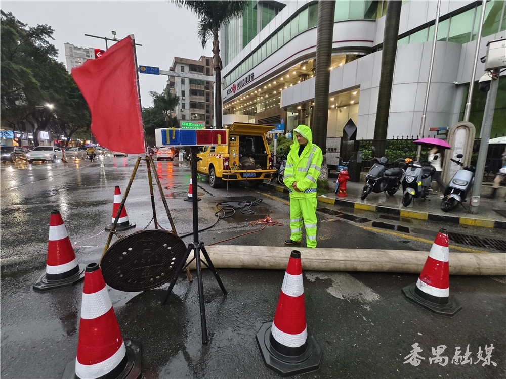 17时,记者赶到市桥街钻汇广场,周边道路只有部分低洼处出现少量积水,番禺区城市排水管理有限公司和市桥街组织的防汛抢险队在不同点位布防,其中,钻汇广场北门和西南门路段采用排水泵进行强排水。