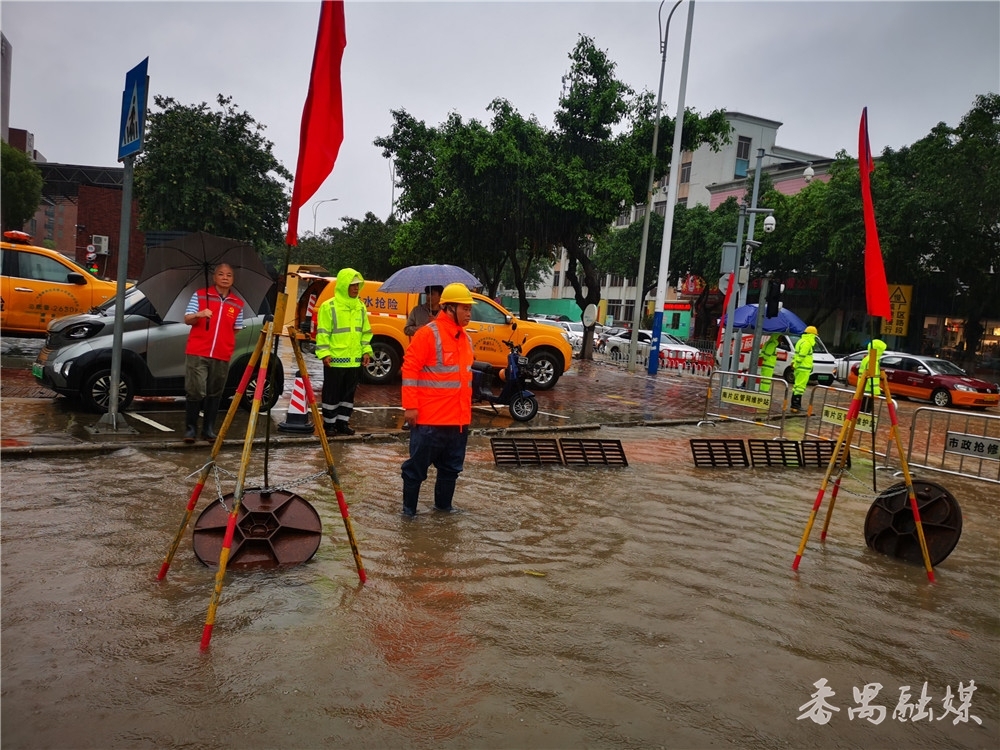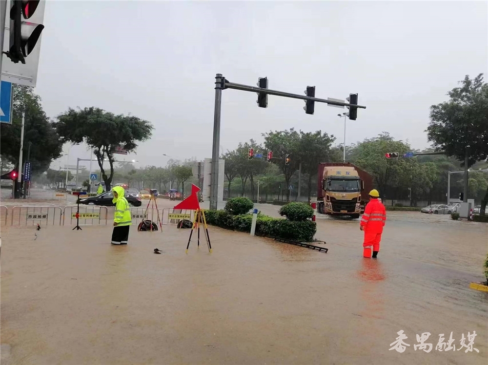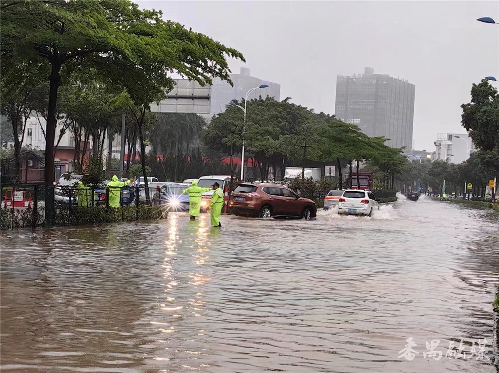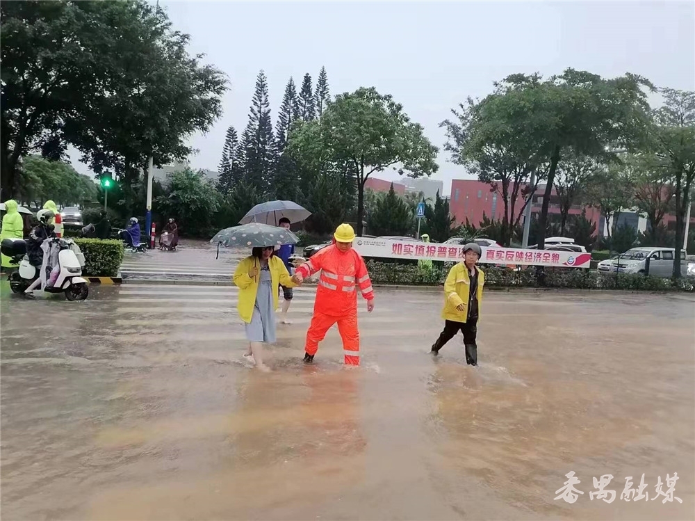 在市莲路海涌路口,辅道积水较深的地方约0.3米,主道也出现积水,番禺区城市排水管理有限公司、广州市道路养护中心南城养护所、石碁镇等单位组织的防汛抢险队伍在现场开展排水和安全保障工作,有的队员护送行动不方便的市民过马路,到18时30多分,路面积水基本消退。