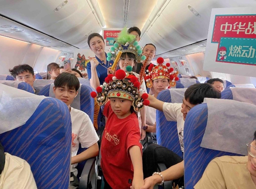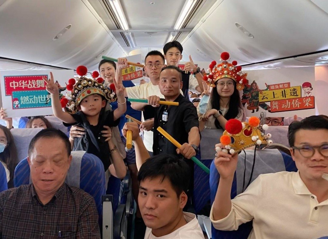 万米高空上演英歌非遗盛宴。5月4日,刚刚结束在泰国巡游展演的普宁富美青年英歌队,与中国南方航空汕头航空有限公司(以下简称“南航汕头”)联合在CZ8356(曼谷-潮汕)航班上共同策划了“云上非遗 舞动‘侨’梁”主题航班活动,向同航班的旅客们展示了英歌文化的独特魅力。