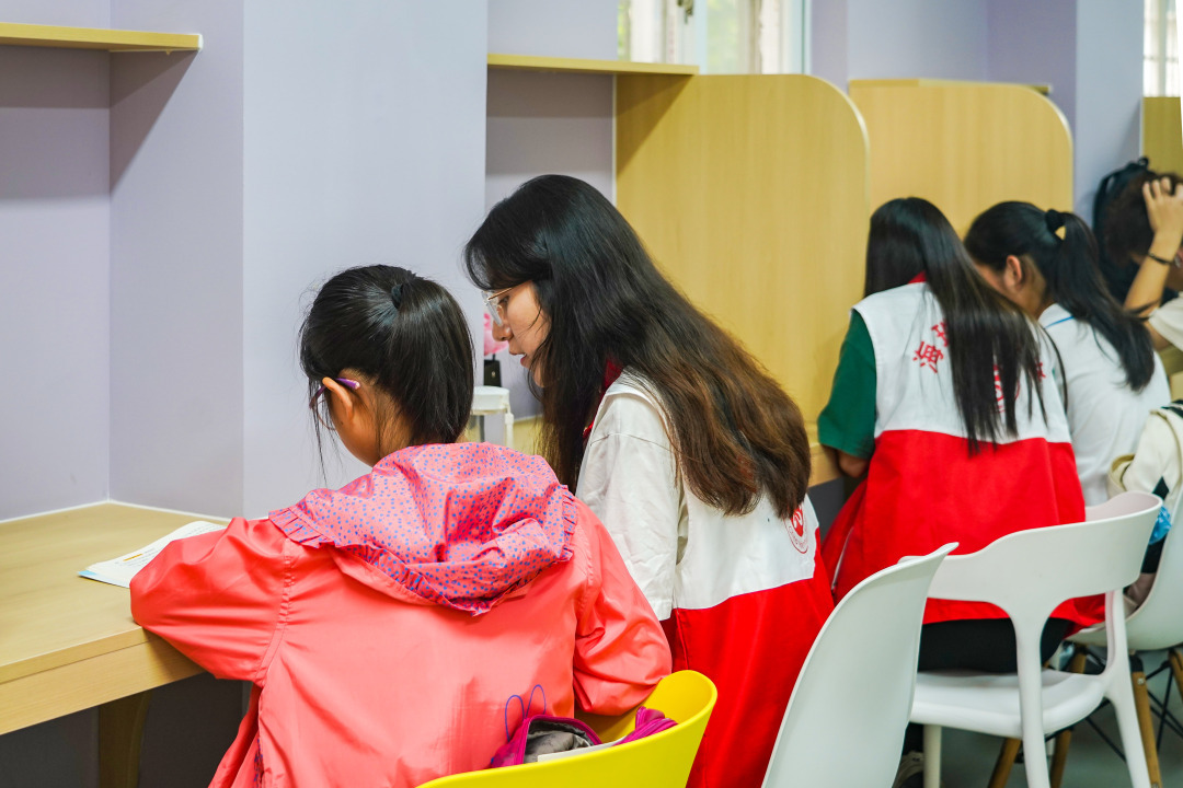 不仅给予情感陪伴,面对来穗青少年放学后无人看管、课业无人辅导、课外教育资源匮乏等问题,团海珠区委联动包括华南师范大学在内的市内高校,成立了“幸福伴读”大学生志愿者服务队,招募81名大学生志愿者作“伴学精灵”,依托12355青少年线下服务中心、街道党群服务中心等阵地,常态化为来穗青少年提供430课后托管、周末伴学课堂。今年以来,该项目开展课业辅导45场,覆盖742名来穗青少年。