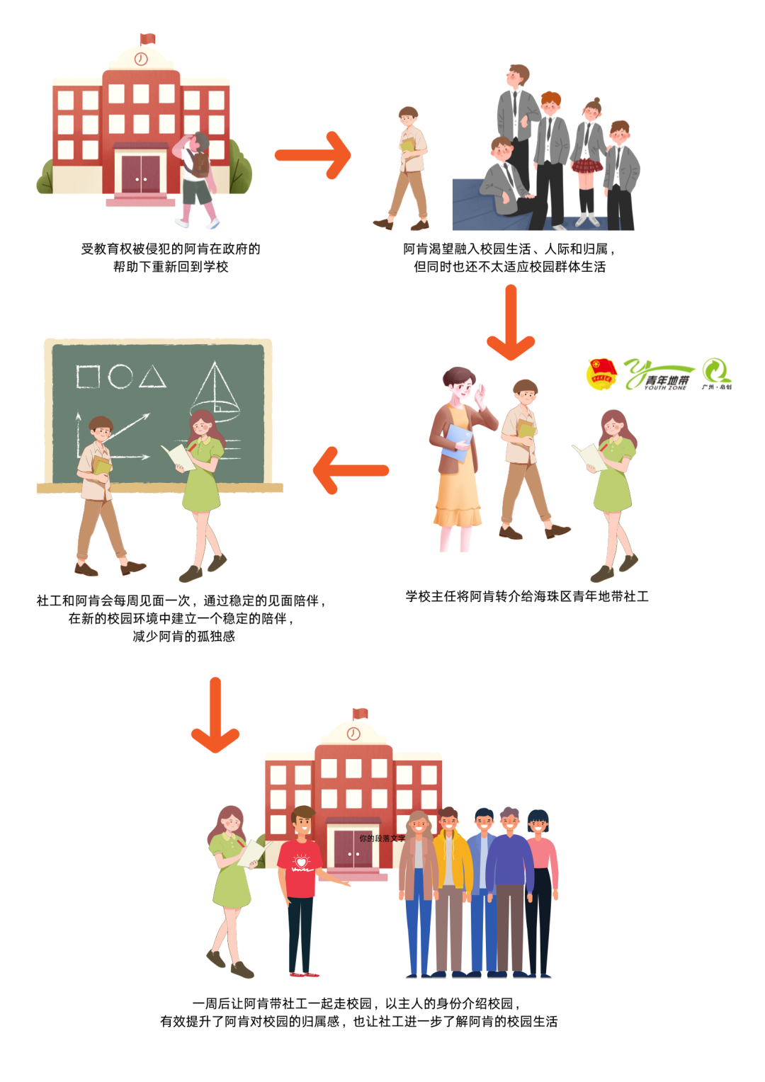 13岁的来穗青少年小曾(化名)成长在一个复杂的家庭环境中,身心备受折磨,还因家庭原因被迫辍学。为了完成学业,她致电12355求助。团海珠区委了解到小曾的情况后,邀请专业的心理咨询师为她带来心理辅导,又联动广州市团委、海珠区教育局等部门,解决小曾户籍和学籍的问题,并为她争取家庭的支持。最终,小曾不仅顺利重返校园,还逐渐走出了心理阴影,重拾自信和勇气。