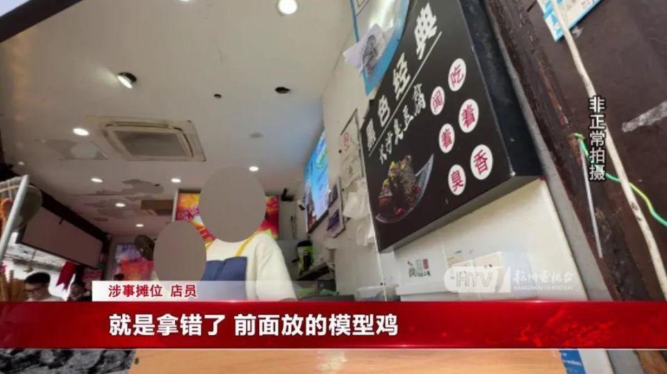 涉事摊位 店员:“就是拿错了,前面放的模型鸡,模型鸡的腰封上有写‘模型’两个字。鸡的进价是20多块钱,然后卖30多块钱。”