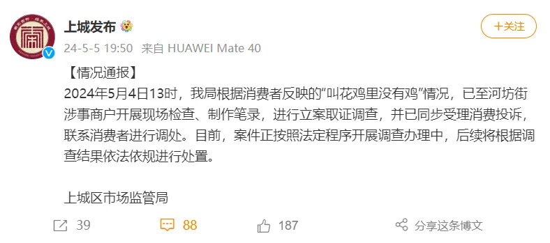 据了解,“出售空包鸡”事件发生后,上城区市场监督管理局及杭州市清河坊历史街区街道管委会对此事件高度重视。5日晚,上城发布也发布通报,称“第一时间对涉事摊位进行了检查和取证,待处理结果出来会第一时间向社会公示。”