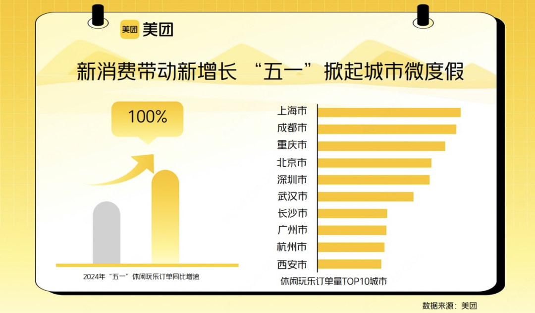 休闲露营、迷你KTV、娃娃屋等订单同比增速超300%,采摘农家乐、萌宠互动、酒吧茶馆订单迎来翻倍增长……5月7日,全媒体记者获悉,美团数据显示,“五一”假期,休闲玩乐订单量同比翻倍增长。数据的背后折射出假期玩乐消费的新趋势与新亮点——“城市微度假”悄然兴起,一站式休闲体验受热捧,多次卡等高质价比消费方式流行。