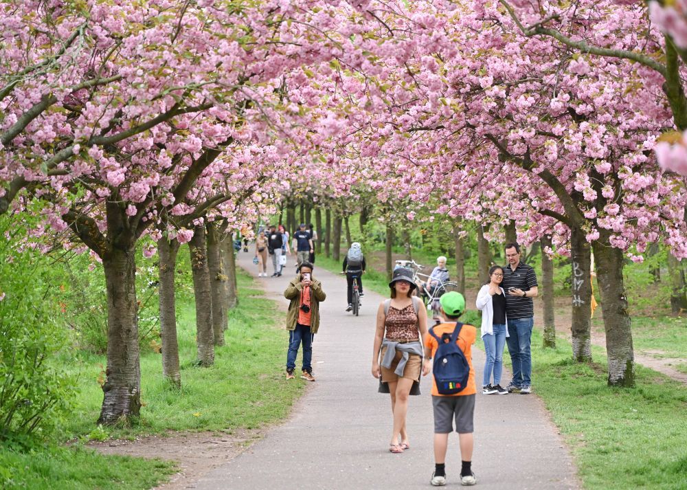 4月9日,在德国柏林,人们走在盛开的樱花树下。新华社记者任鹏飞摄