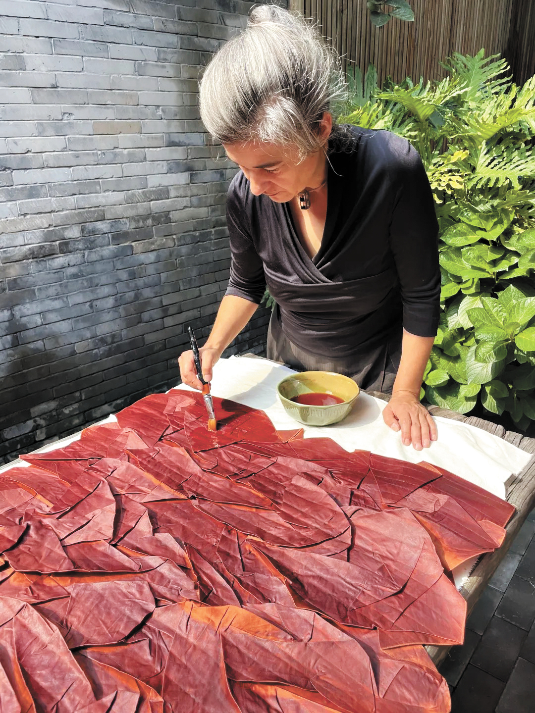 凯瑟琳用薯莨汁覆染作品。