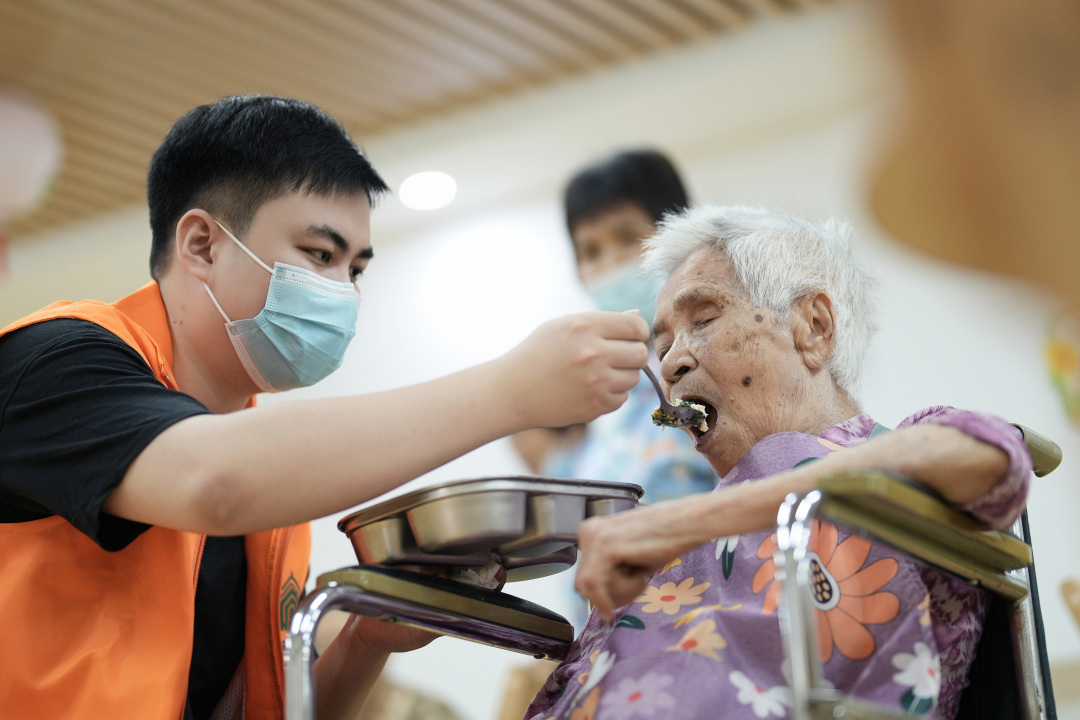 4月28日, “90后”梁俊明在为长者喂饭。 “把老人们当成自己的爷爷奶奶,用心用情去照顾他们” 是梁俊明给自已定的“工作标准”。