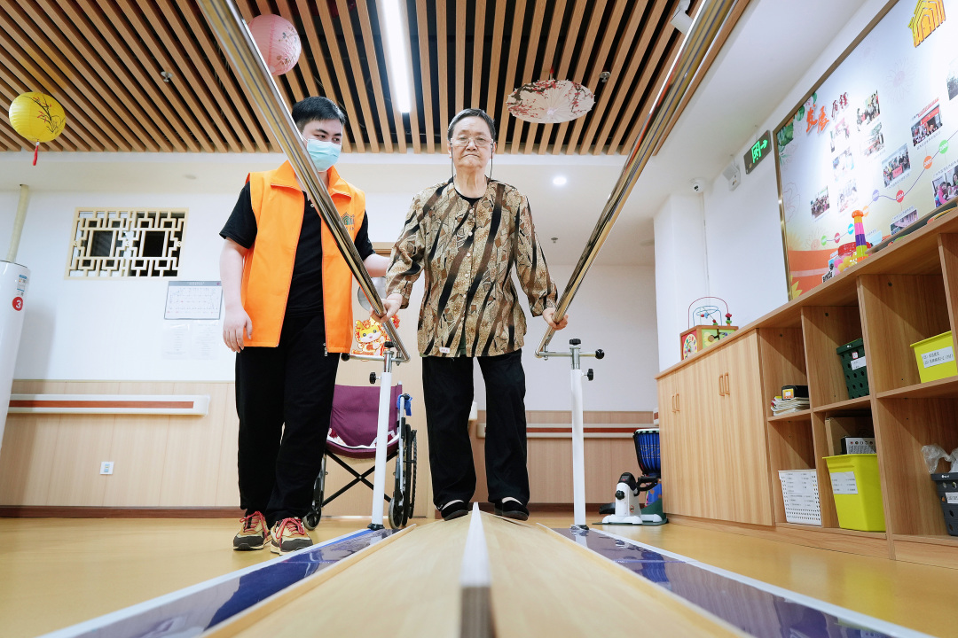 4月28日,广州侨颐尚善养老院,“90后”院长梁俊明陪长者走平衡木,领着她进行康复训练。