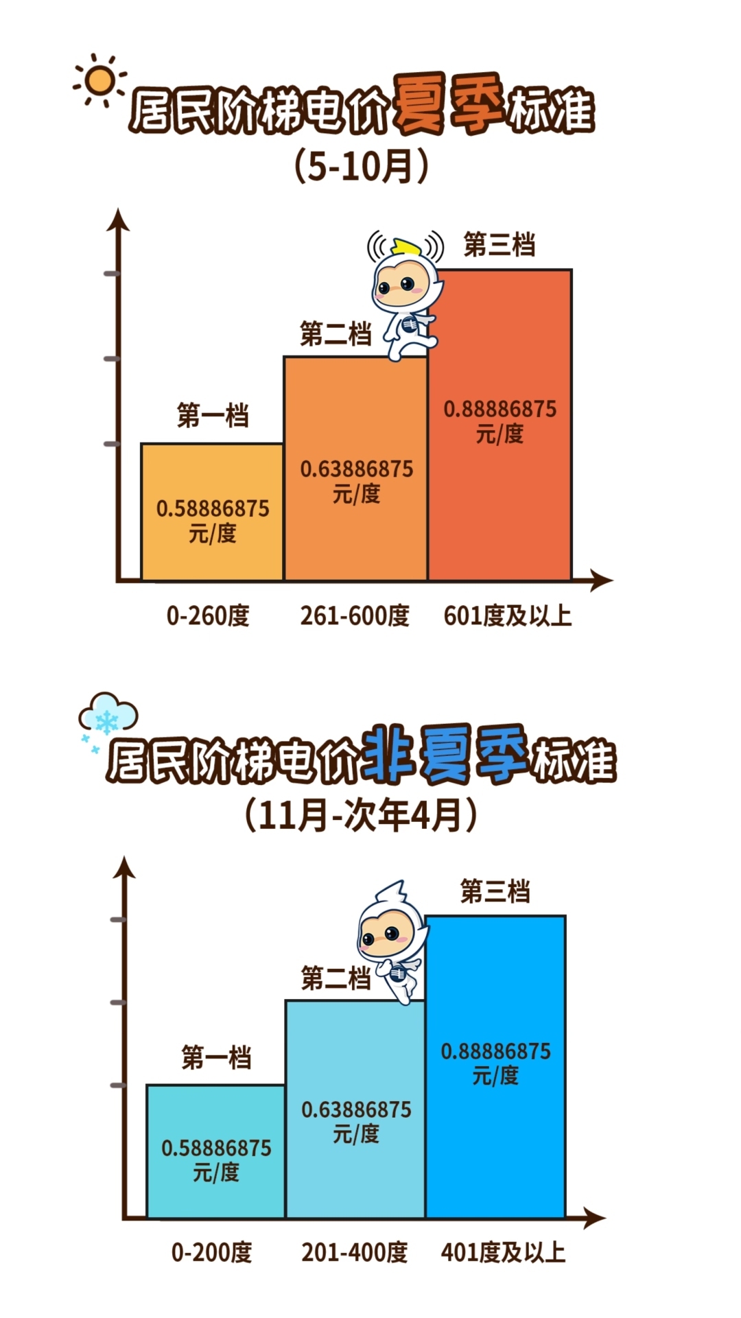 以广州居民王先生家用电为例,假设5月和12月王先生家用电量均为600度,5月夏季电费为260×0.589+(600-260)×0.639,约为370.4元。12月非夏季电费为200×0.589+(400-200)×0.639+(600-400)×0.889,约为423.4元。在相同600度用电量的情况下,由于夏季标准每档电量更多,王先生家夏季标准的电费低于非夏季标准的电费。