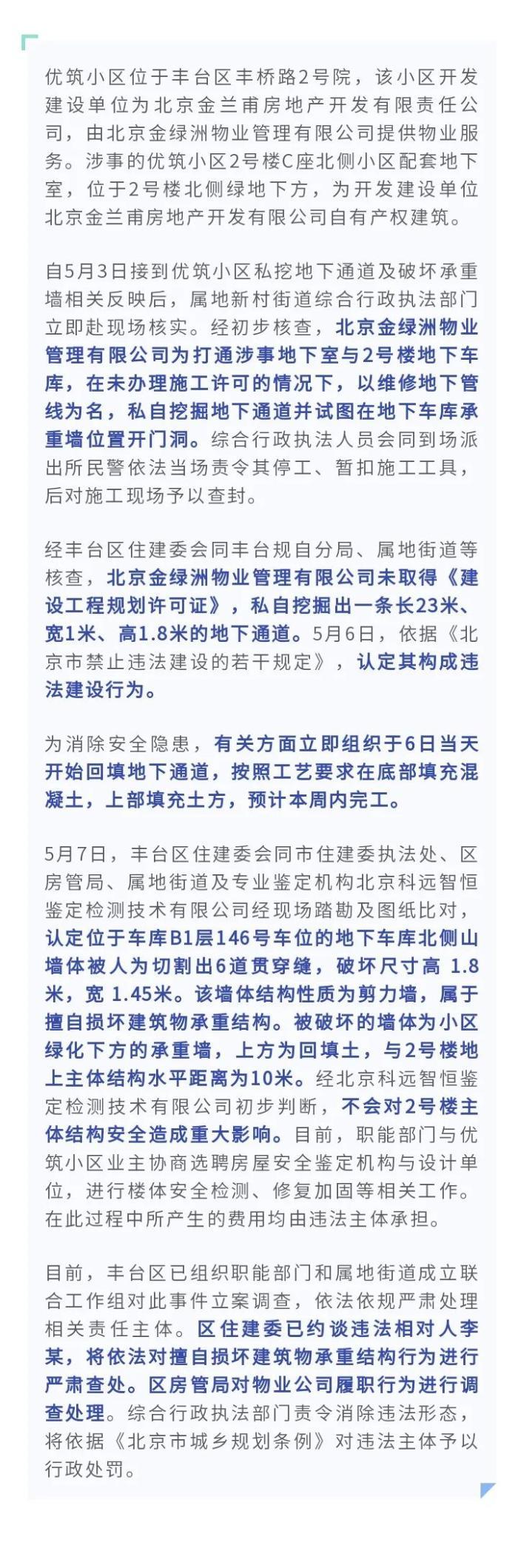 针对丰桥路2号院优筑小区私挖地下通道事件,今天(5月9日),北京市丰台区住房和城乡建设委员会、北京市丰台区房屋管理局发布情况通报,内容如下: