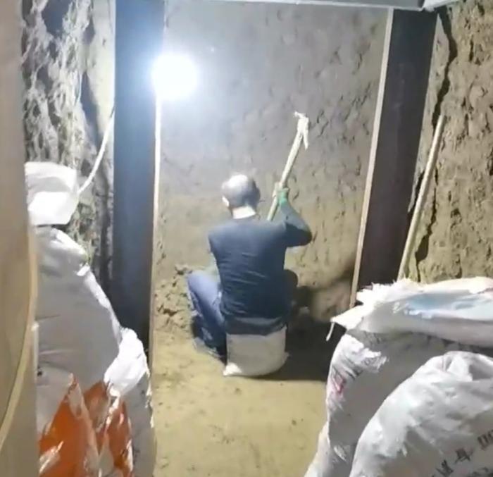 在居民提供的一段拍摄于5月4日的视频中,几位居民沿着被挖开的地下空间,一路向深处曲曲折折走了几十米,在地道尽头看到了施工人员正在举着铁镐开凿土层。“师傅,这是要往哪儿挖呀?”一位居民问。“往地下车库挖。”一名施工人员回答。居民们又问施工负责人是谁,这名工人支支吾吾地说:“他今天没在……”