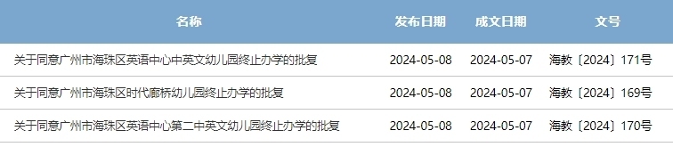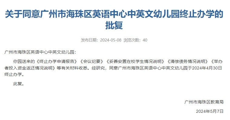5月8日,广州市海珠区教育局在信息公开平台发布关于同意海珠区英语中心中英文幼儿园、海珠区时代廊桥幼儿园、海珠区英语中心第二中英文幼儿园终止办学的批复。