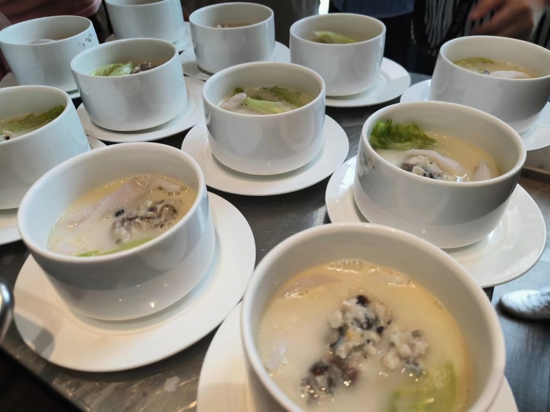 据介绍,“金米海参蓑衣球过桥沙虫汤”中的“蓑衣球”实则为“鱼肉球”。黄秀卿说,因旧时疍家人穿戴斗笠蓑衣运用多种厨艺烹饪鲜鱼的场景深深地印刻在了她的脑海里,为此她特别想重现这样一个具有画面感的场景,于是“寓情于汤”。