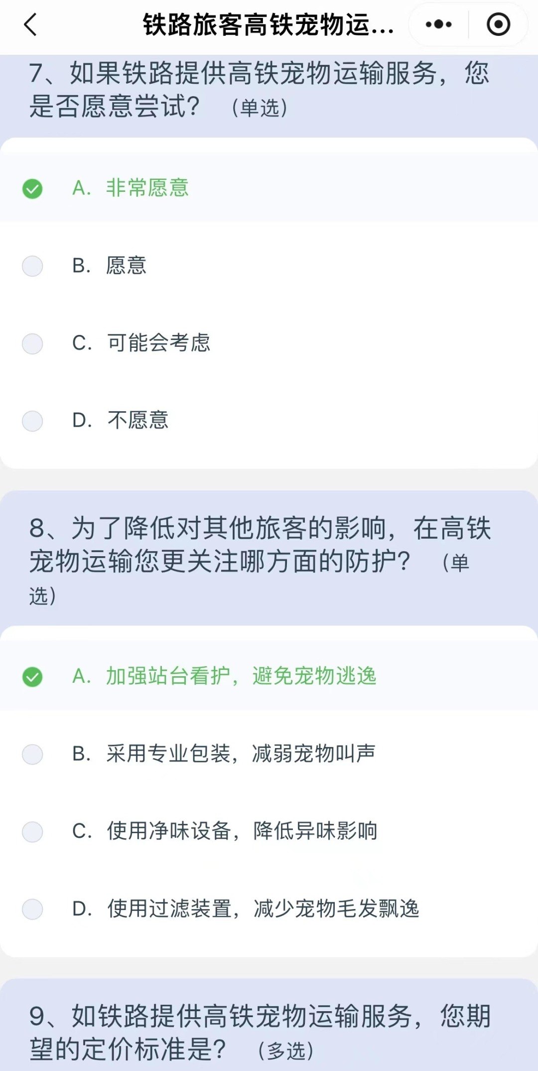 宠物运输服务定价标准方面,该问卷包括以下几个选项:按照航空宠物运输定价标准,比航空宠物运输价格略低;按照宠物重量计费;按照乘车距离计费。降低对其他旅客的影响方面,该问卷提供了几个防护选项:加强站台看护,避免宠物逃逸;采用专业包装,减弱宠物叫声;使用净味设备,降低异味影响;使用净味设备,降低异味影响。旅客希望提供的增值服务方面,问卷选项包括代办检疫证、接送宠物、与主人同车次运输、专人押运、全程监控等。同时,这份问卷也向非养宠人士设置了相关问题,收集这些旅客对高铁宠物运输的建议。