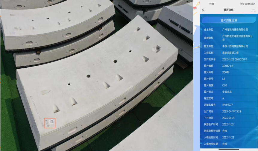 据介绍,海珠湾隧道生产出的每一片管片都有其独一无二的“身份证”,通过在管片上喷制二维码,为其建立信息档案,记录生产、运输、存放、使用过程中全生命周期的所有信息,实现管片的浇筑、蒸养、出厂、运输、存放、使用以及批次、检测数据等“一码通查”,贯穿成环生产、成环运输、成环存放、成环使用全过程。
