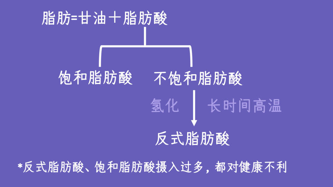 脂肪酸分为饱和脂肪酸和不饱和脂肪酸。饱和脂肪酸结构相对稳定,而不饱和脂肪酸结构不稳定,容易被氧化变质,如果在后期的加工过程中氢化不完全,天然顺势结构就会异变成反式结构,“黑化”成了反式脂肪酸。