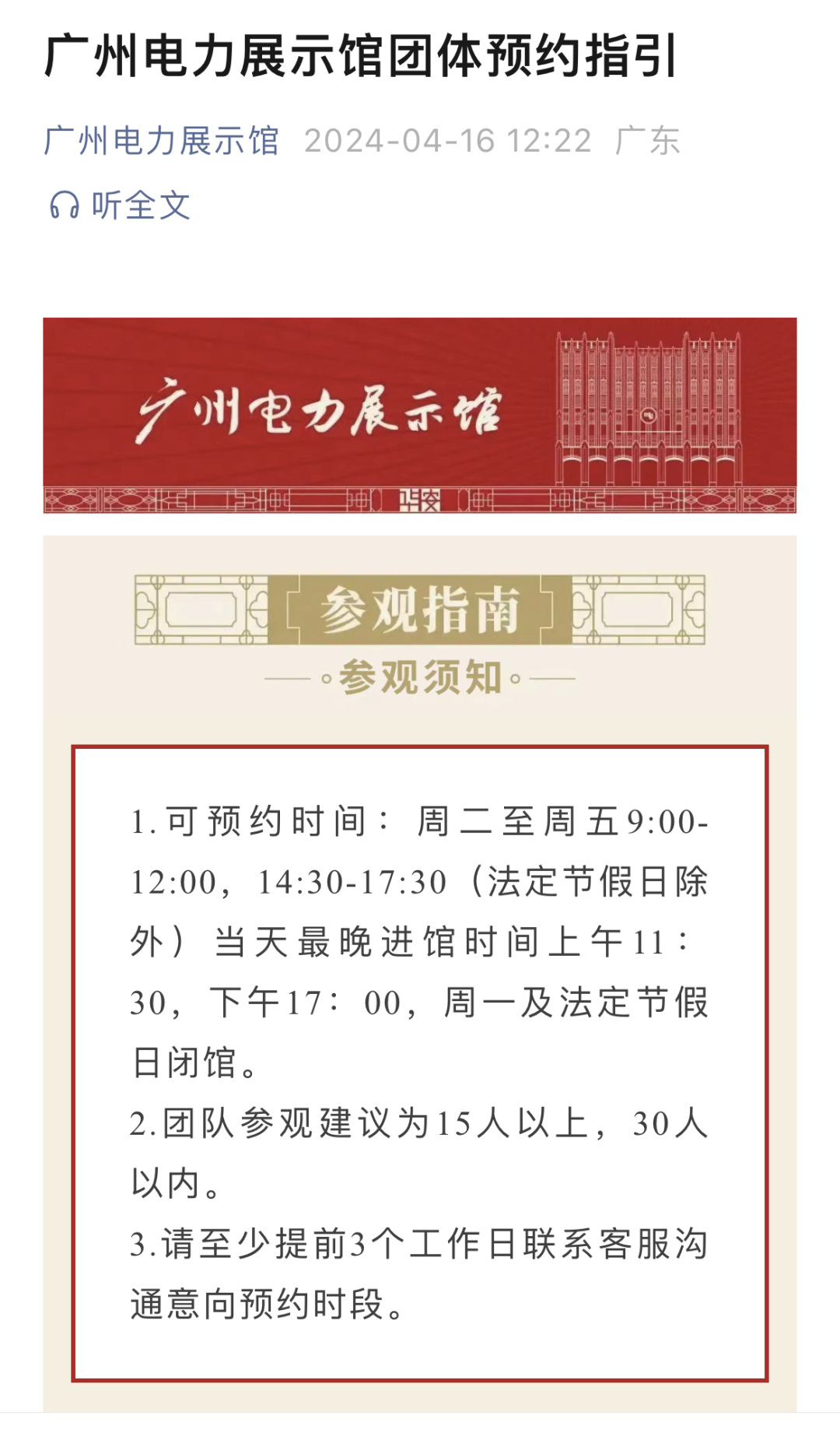 据介绍,广州电力展示馆(华安楼)位于泰康路,接受团体预约参观,建议为15人以上、30人以内,市民可通过广州电力展示馆微信公众号预约,提前至少3个工作日联系客服沟通意向预约时段,周一及法定节假日闭馆。
