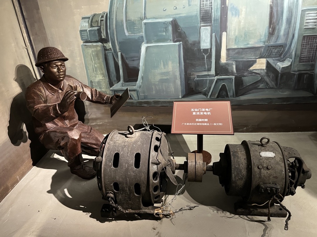 “这是民国时期(1925年)五仙门发电厂的直流发电机,广州现存最早的发电机之一。”广东革命历史博物馆党总支书记李岚说,“旁边这两支是1949年护厂运动中,五仙门发电厂工人使用过的‘武器’,成功守住了广州的光明。”