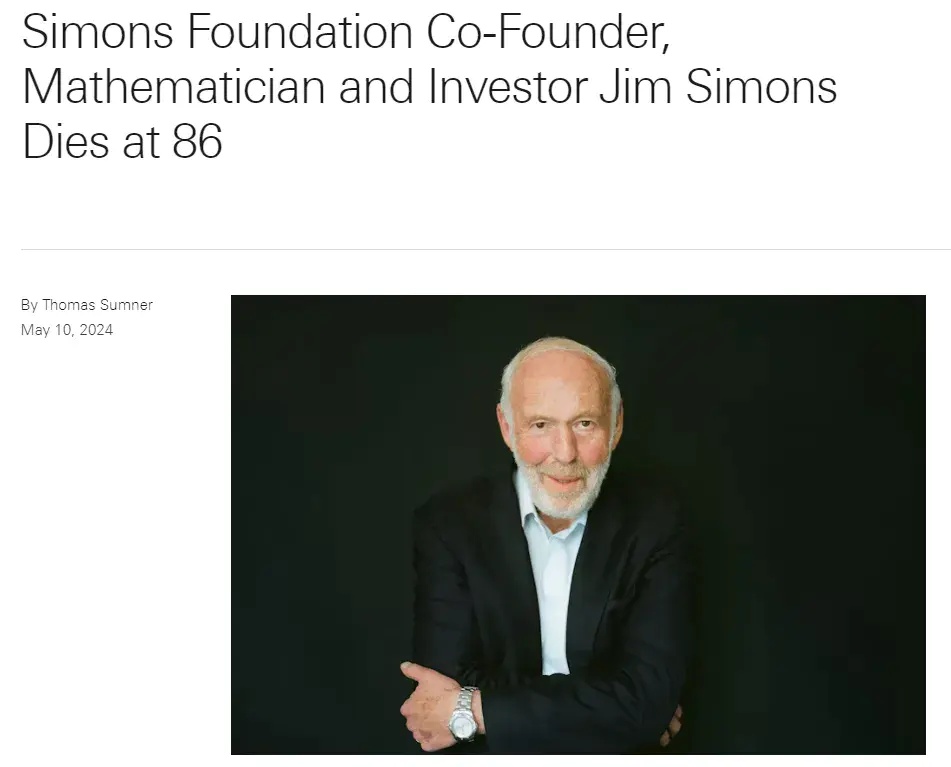 西蒙斯基金会怀着极大的悲痛宣布,联合创始人兼名誉主席詹姆斯·哈里斯·西蒙斯(James Harris Simons)于2024年5月10日在纽约市去世,享年86岁。