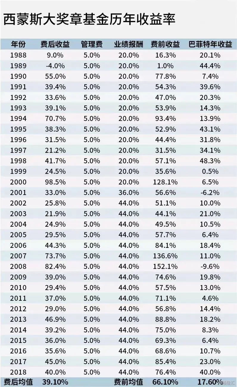 据悉,文艺复兴科技的第一支基金产品——大奖章基金被称为“印钞机”。从1988年到2019年大奖章基金年化收益率为39%(费前收益率则是66%!该基金收取5%管理费和44%的业绩激励,规模为100亿美元),这样的投资业绩迄今为止独步全球、无出其右者。与之相比,巴菲特1965年—2018年的年均净值增长率为21%、索罗斯旗下量子基金从1969年—2000年的年均收益是32%。
