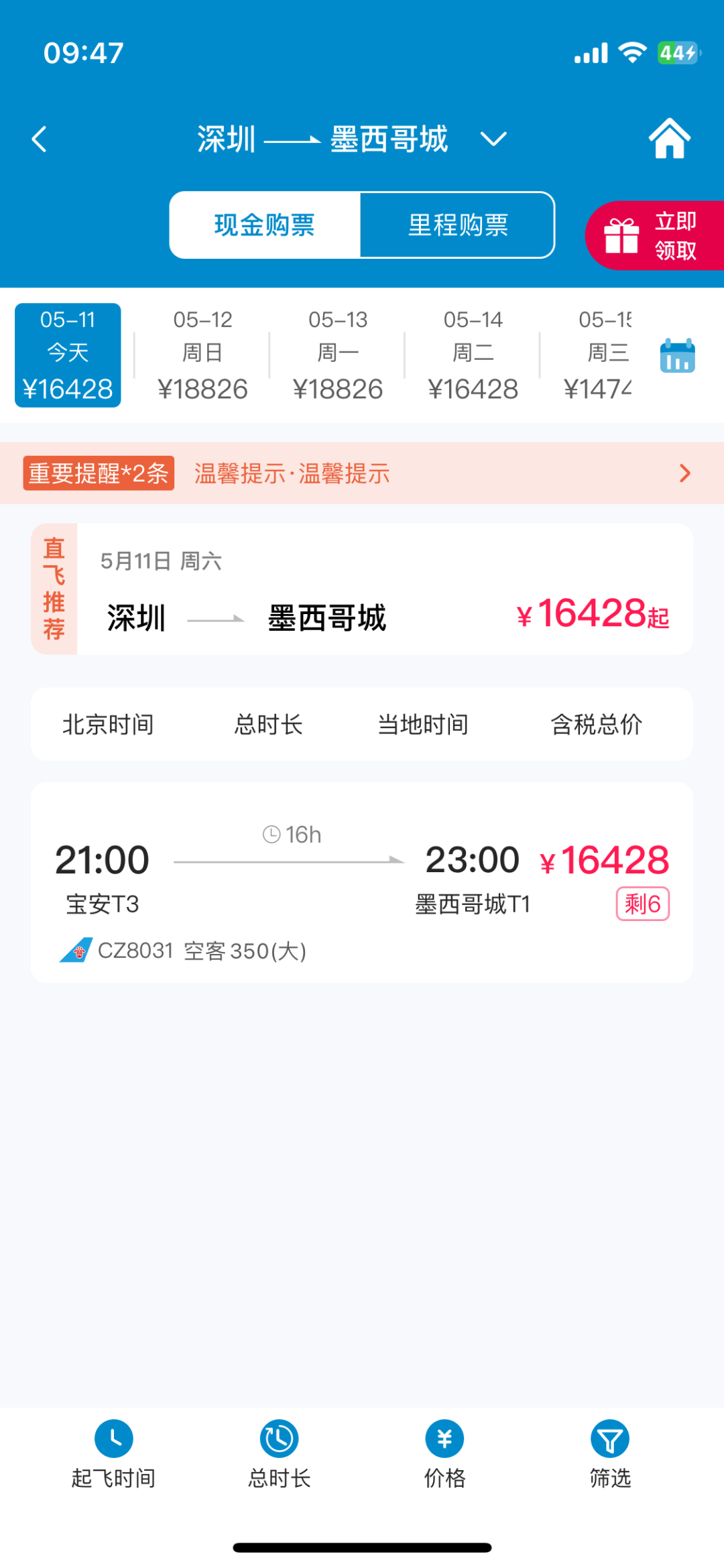5月11日,南航将开通深圳直飞墨西哥城航线,该航线目前一周两班,由空客A350执飞,去程计划每周二、周六执行,北京时间21:00从深圳起飞,当地时间23:00抵达墨西哥城,飞行时长16小时。回程计划每周三、周日执行,去程CZ8031于飞行时长16小时。回程CZ8032于当地时间凌晨01:00从墨西哥城起飞,中途技术经停蒂华纳,于北京时间12:20到达深圳。