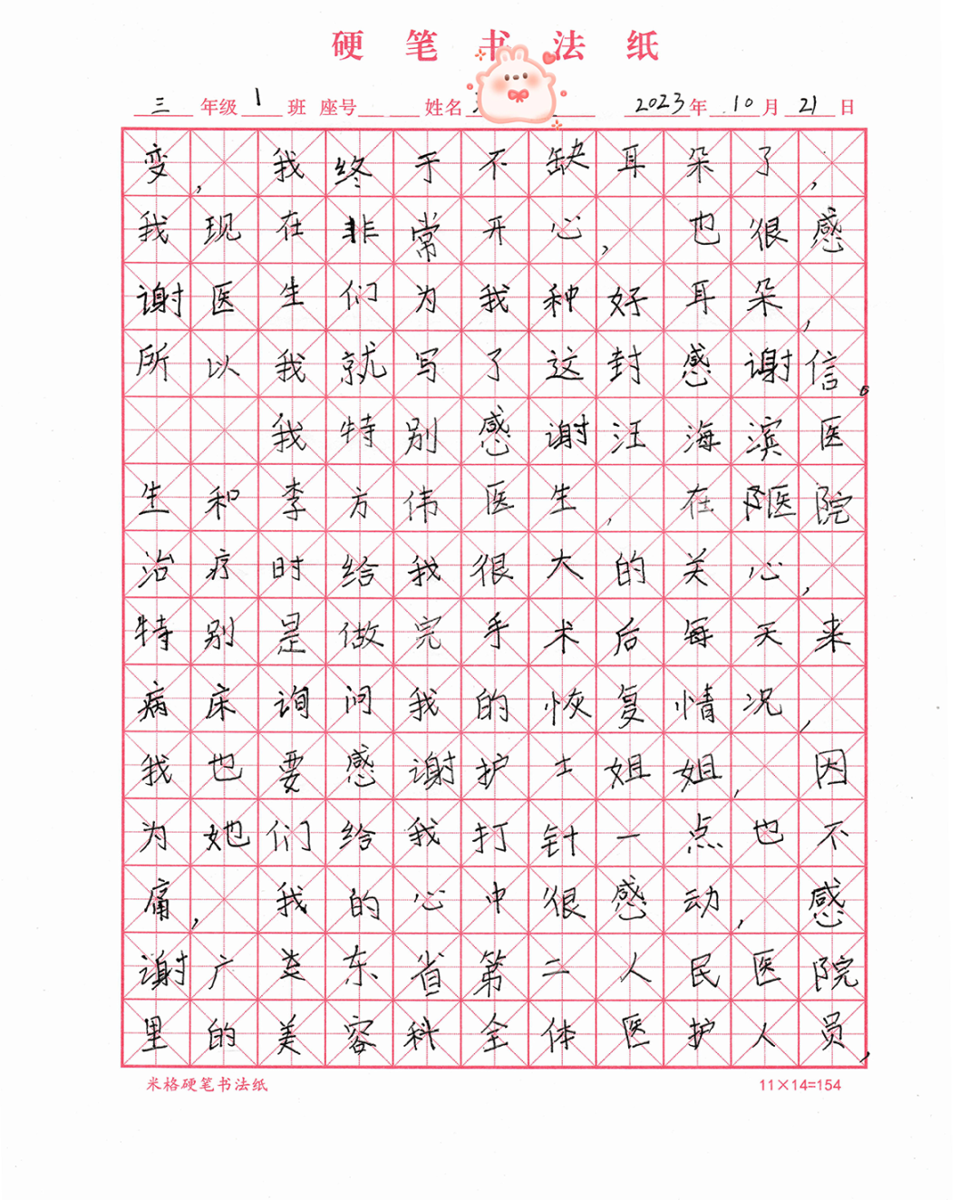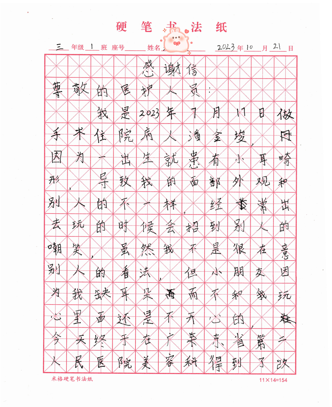 这样的温情还延续到院外。一期手术结束后,医护团队到俊俊家探访。前一晚,俊俊在他的硬笔书法纸上,工工整整写好一封《感谢信》。