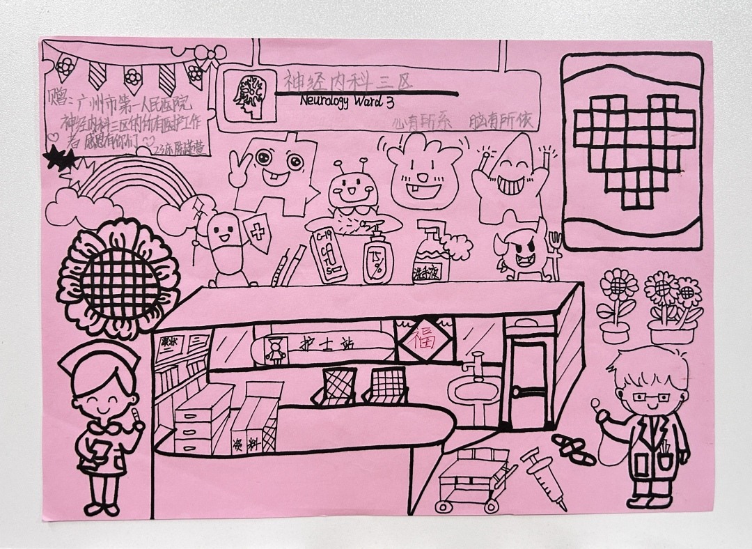 随着小阳的身体一天天好转,分别的日子也越来越近。小阳特地写了一封感谢信,感谢陈智芳,感谢神经内科的所有医护,也亲手画了一封护士站的简笔画,因为那是护士姐姐们忙碌的地方。