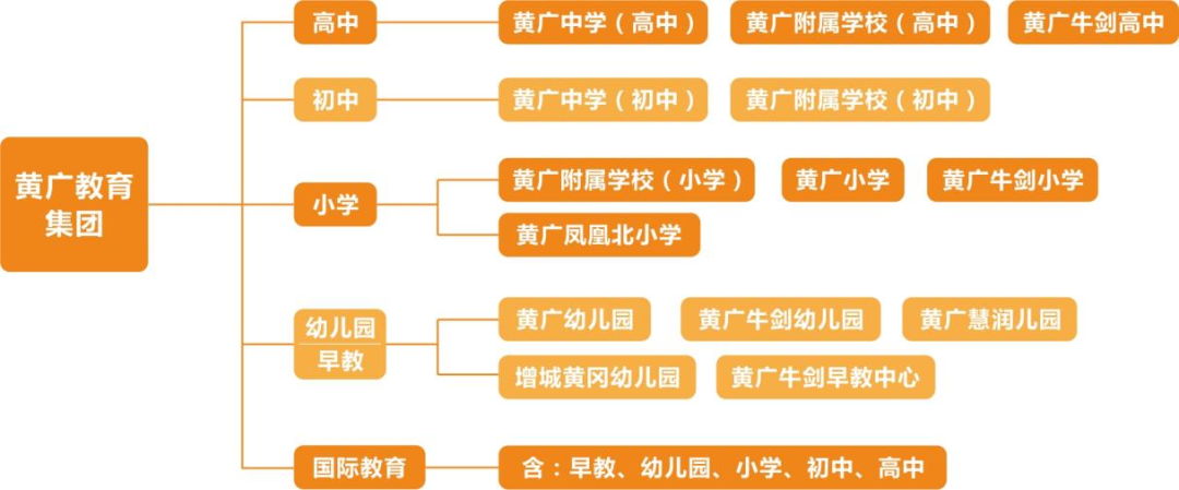 黄广教育集团旗下学校含早教、幼儿园、小学、初中、高中,是K16纵向一体化教育集团,在校学生2万余人,教工近3000人。该集团目前设立了15个办学模块,含3个高中、2个初中、4个小学、5个幼儿园、1个国际教育部。