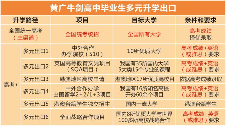 黄广牛剑高中作为优质普通高中,依托黄广教育集团旗下优质资源,以全国领先的智慧教育体系等核心竞争力为办学密码,助力每一位学生低进高出、高进优出、优进尖出,服务于广大“黄广高中迷”,以孩子参加国内高考、升国内一流大学为主要方向(100%学生享有的升学通道)。