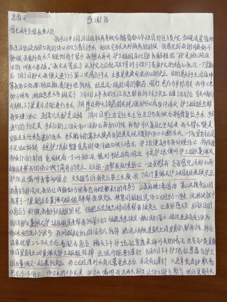 在感谢信中,她详细地分享了医生的每一次清创、护理人员的每一次引流、每一次换药,赞叹了医护人员的精湛技艺和无比的耐心、爱心。