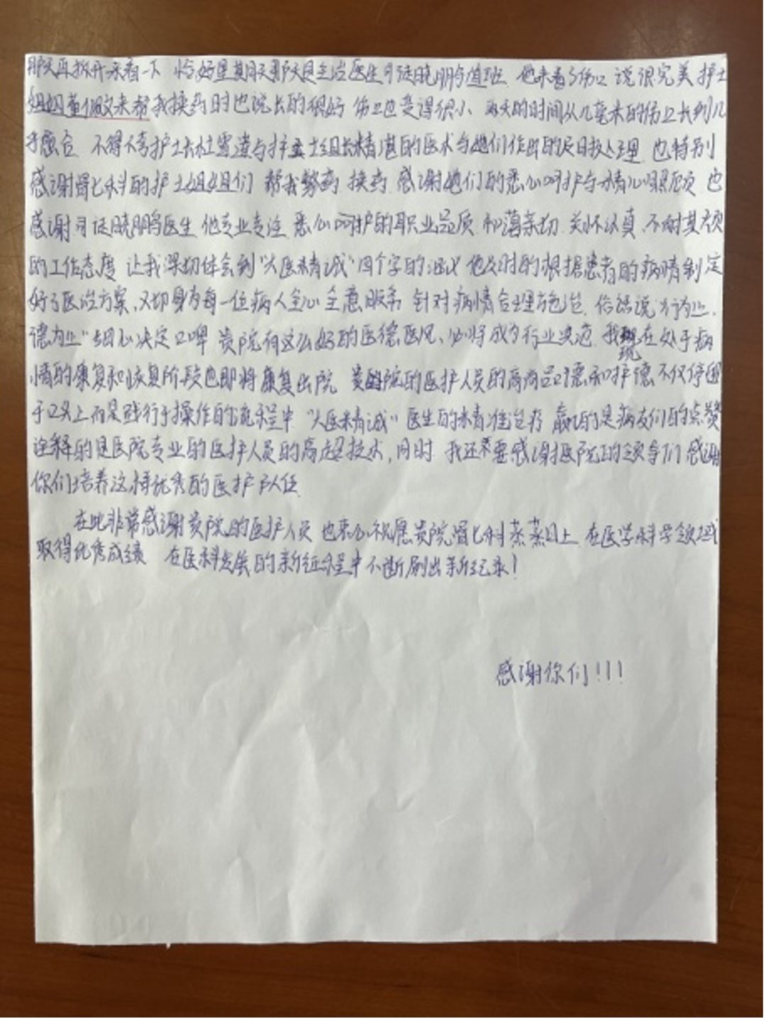 为了解决这个棘手的问题,经过科室杜雪莲护士长评估后,专科护士董佩文被安排为小梁实施科室自创的简易伤口负压引流术,在董佩文的细致照料下,经过12天3次负压引流,小梁的伤口终于愈合。出院前,她留下了一封长长的感谢信。
