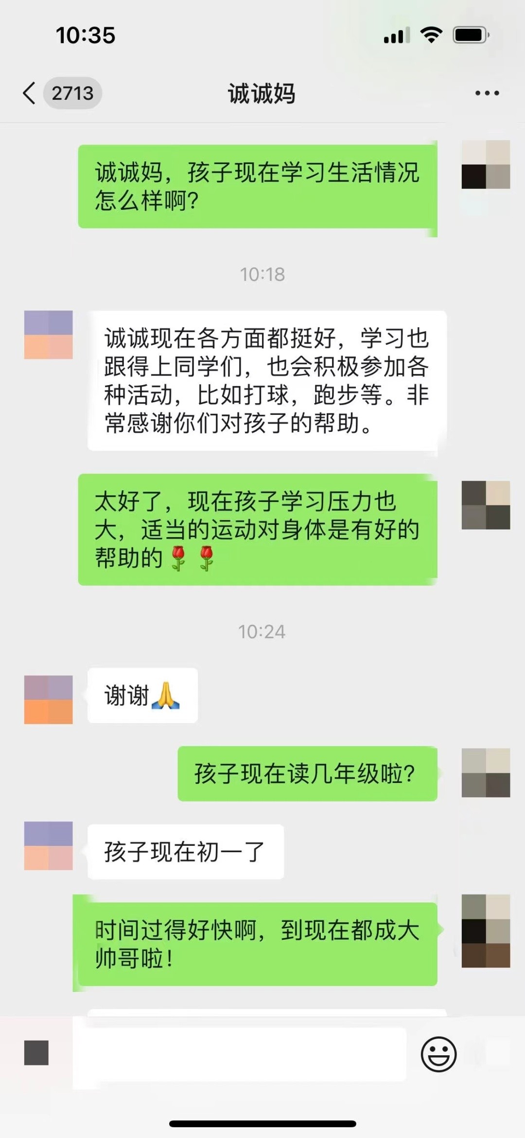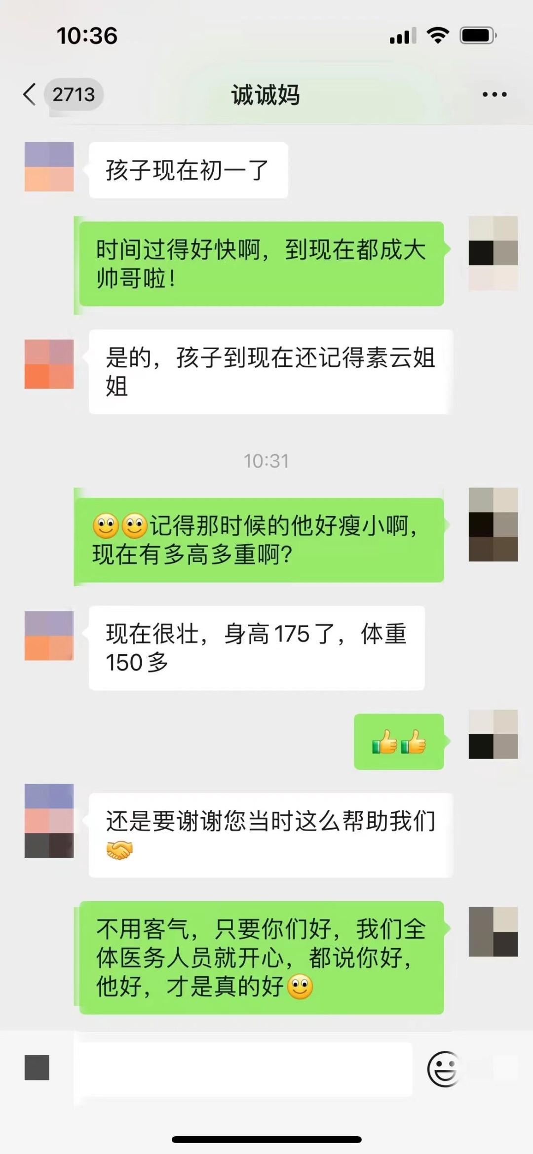 从那时起,这段护患之缘用更亲切的方式延续了下去。吴素云与诚诚妈妈互加了微信,隔空见证着诚诚长大了,长高了,学了很多本领......