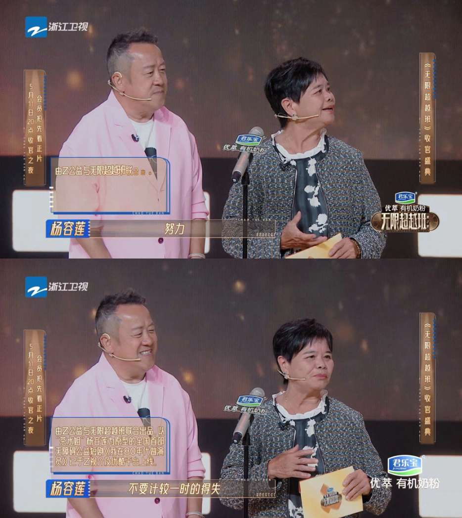 演员培训综艺《无限超越班》第二季昨晚收官,曾经从成龙手上接过第37届香港金像奖“专业精神奖”的“茶水姐”杨容莲受优酷邀请来到收官礼现场,为演员高海宁颁发“无限精神艺员奖”,鼓励青年演员专业敬业。“茶水姐”对青年演员们说:“努力啊,不要计较一时的得失。”