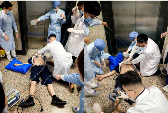 “救命啊!有人晕倒!”电梯内,同乘人员的求救声急促而惊恐。在这生死攸关的时刻,电梯附近的神经内科和康复科的医护人员如同神兵天降,他们迅速响应,展开了一场与死神赛跑的较量。邝景云护长和雪莹组长临危不乱,统筹全局;蔡传萍医生和段振鹏医生争分夺秒,心脏按压;徐志锋医生精准施救,除颤操作;罗小英、黄金英和江剑鸣护长默契配合,确保患者呼吸畅通。每一个动作都精确无误!