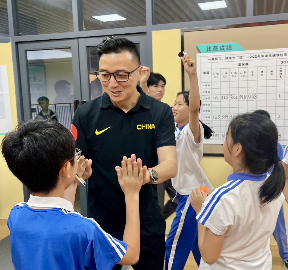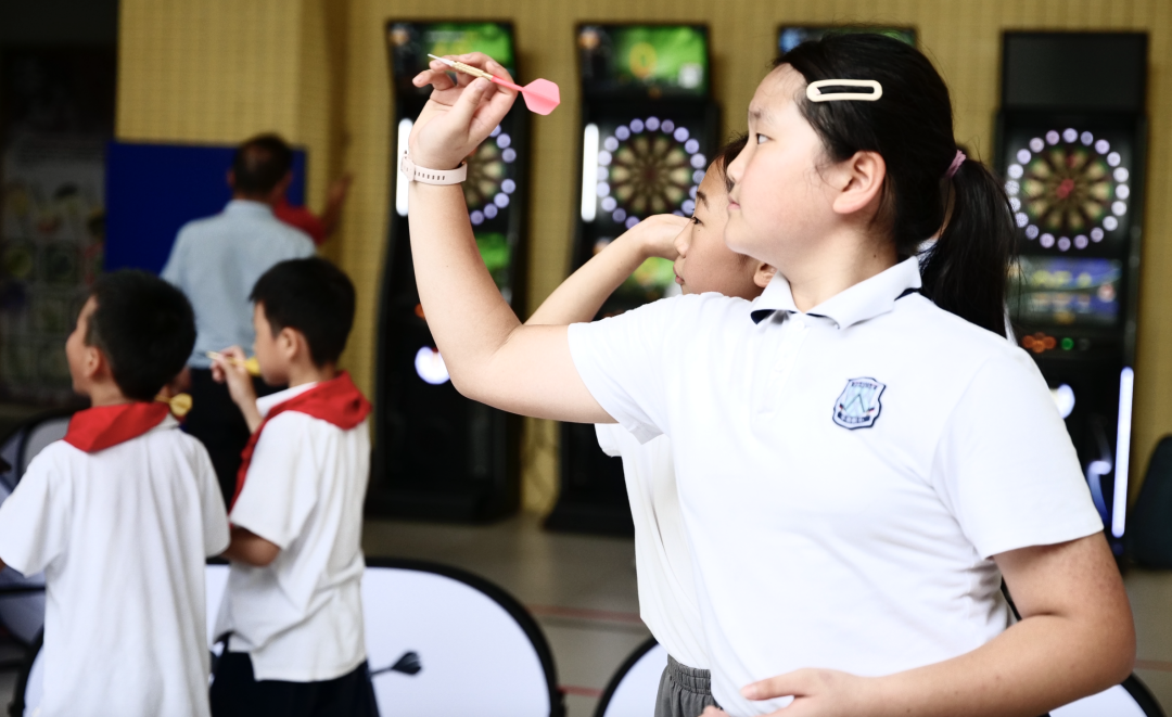 深圳南山南头城学校书记程磊与热爱飞镖运动的学生们。