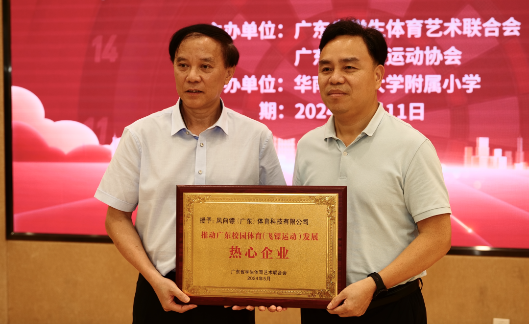 广东省学生体育艺术联合会会长朱征宇向风向镖(广东)体育科技有限公司董事长冯伯权颁发感谢牌匾。